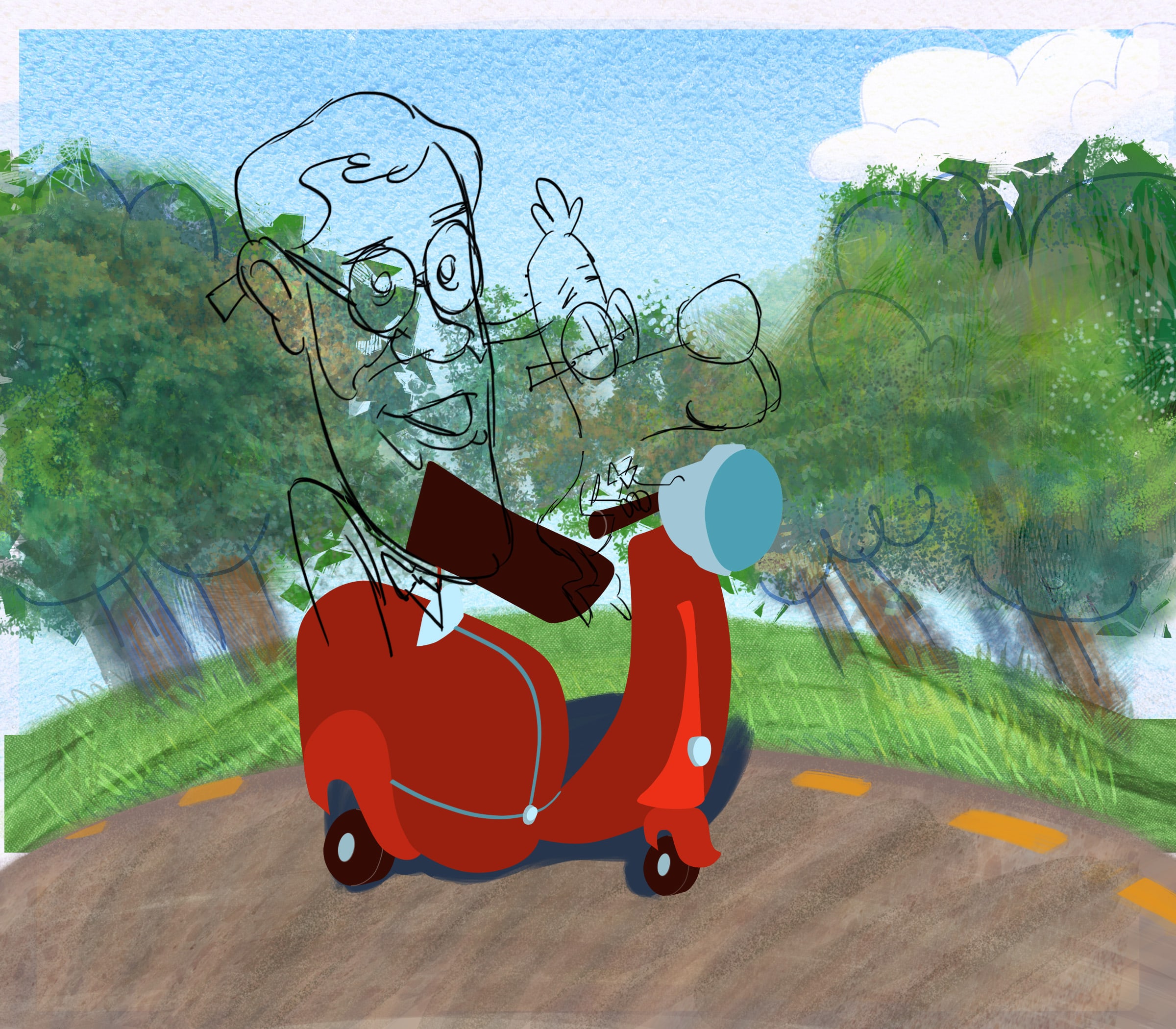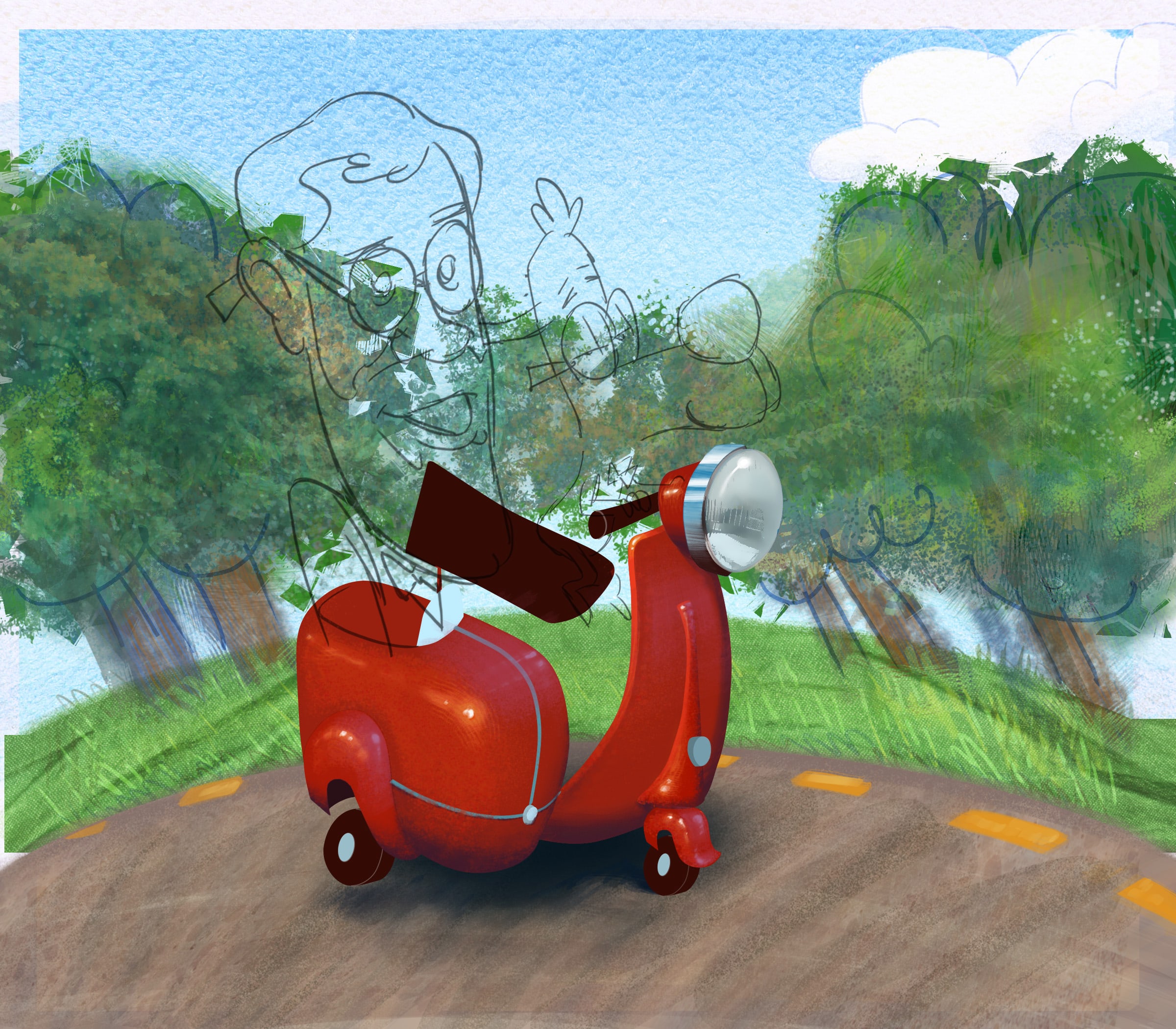 I isolated the scooter into clean shapes to keep the geometrical design sharp. Shadows, bounce, and highlights were added.