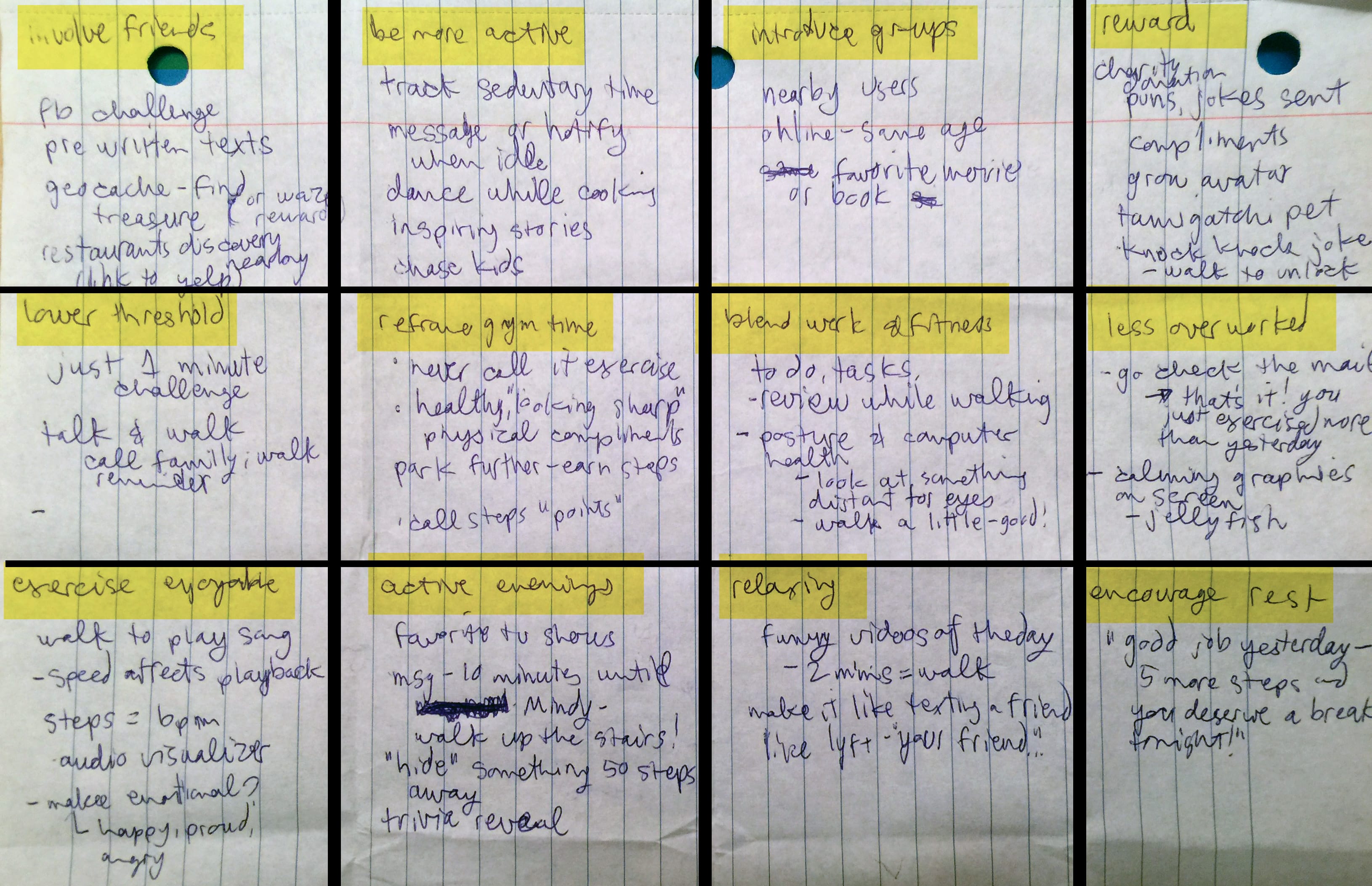 I conducted interviews of new users of Fitbit, Jawbone, and pedometer apps. Some of the questions I looked to answer were:
