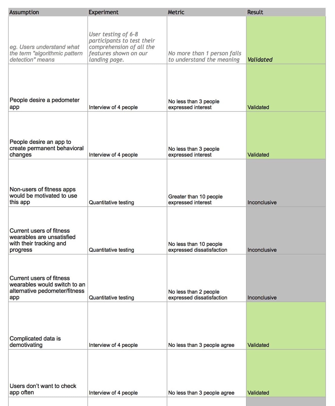 I created a validated learning canvas to quickly test any assumptions in an organized and methodical fashion. First I listed all assumptions trying to be detailed, specific, and measurable. Next I worked out what the best testing method would be and whether to do more quantitative or usability testing. I defined an acceptable pass rate for each experiment and categorized the results.